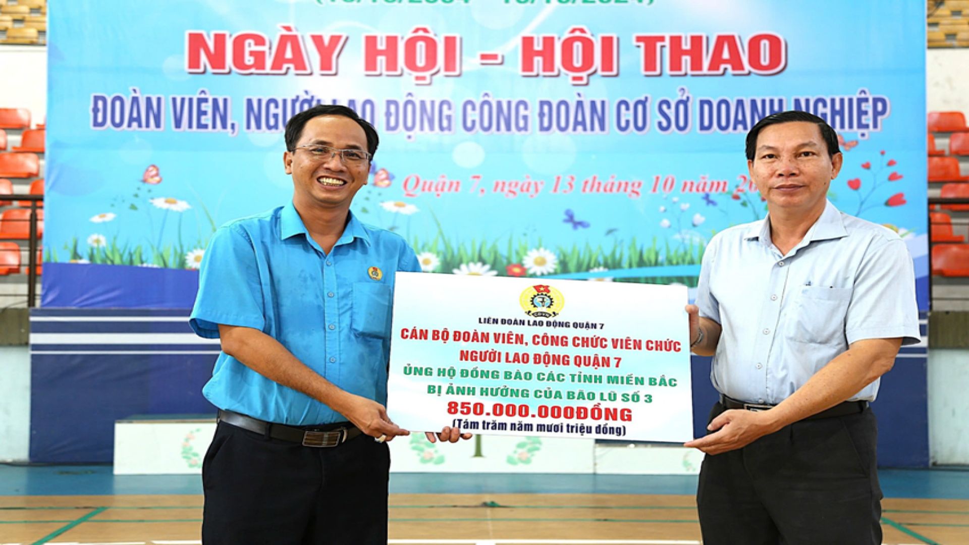 Trong chương trình Ngày hội - Hội thao, LĐLĐ quận đã trao số tiền 850 triệu đồng cho Ủy ban MTTQ Việt Nam quận ủng hộ đồng bào chịu thiệt hại sau bão số 3. Được biết, thời gian qua, LĐLĐ quận đã phát động trong đoàn viên, công nhân viên chức, người lao động ủng hộ với số tiền gần 1.469.737.392 đồng, số tiền còn lại đã chuyển về LĐLĐ Thành phố.
