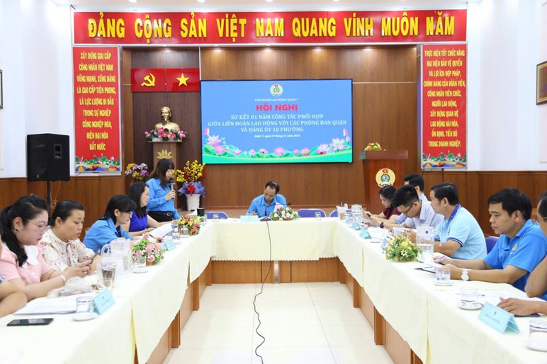 Sáng 29/11/2024, Liên đoàn Lao động (LĐLĐ) Quận 7 tổ chức hội nghị sơ kết 01 năm công tác phối hợp giữa LĐLĐ với các cơ quan, phòng ban quận và Đảng ủy 10 phường năm 2024. Đồng chí Võ Khắc Bình, Chủ tịch LĐLĐ Quận 7 chủ trì hội nghị. Đến tham dự có các đồng chí lãnh đạo Phòng Lao động Thương Binh – Xã hội quận, Phòng Kinh Tế quận, Bảo Hiểm Xã hội quận, Chi Cục Thuế khu vực Quận 7-Nhà Bè và đại diện Thường trực Đảng uỷ 10 Phường.